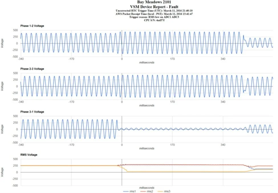 VoltSense™ is a practical, easy-to-deploy product that can provide a quick payback in benefits. Intended users include power system engineers and technicians, outage management personnel, and power restoration crews. Benefits are both “hard”, such as reduced costs for power restoration and “soft”, such as increased reliability and happier customers. Users periodically obtain and review historical reports showing the voltage steady state behavior and disturbances. These reports can be used to determine if the distribution system voltage regulation is operating correctly, if capacitor banks are operating properly, if the voltage provided to customers is adequate, and if customer-side issues are leading to poor power quality. An example of waveform capture from a VoltSense™ sensor is shown in the Figure below: